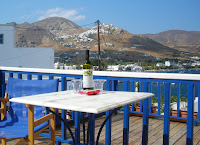Mit unserem Hotel "Areti" *) sind wir sehr zufrieden. Es steht auf einem kleinen Hügel am fähranlegerseitigen Ortsende, der sich zwischen der Anlegestelle und dem schönen, ruhigen Strand "Livadakia" erhebt. Zur Fähre und zum Livadakia-Strand geht man jeweils nur rund fünf Minuten zu Fuß. Auch zum Ortszentrum sind es nur wenige Minuten. Statt der Straße zum Fähranleger und weiter am Meer entlang kann man auch Treppen auf der anderen Seite des Hügels hinab nehmen, die neben einer kleinen Mofavermietung auf die ins Zentrum führende Uferstraße münden. Von der Anlegestelle aus sieht man das Hotel oben am Hang zwischen anderen Gebäuden etwas versteckt liegen. Nur aus dem richtigen Winkel ist die Aufschrift "Hotel ARETI" zu lesen. Wir hatten sie gestern im Dunkel nicht erspät. Unser Zimmer Nr. 9 im ersten Stock ist geräumig und hat eine große, zur Hälfte mit Schilf überdachte Terrassse, von der wir auf den Hafen, den Hauptstrand des Ortes und Chora oben am Berg blicken (s. Foto - zum Vergrößern bitte anklicken). Der WC/Duschraum ist wie meist in Griechenland klein, doch hat er zumindest eine Ummauerung des Duschplatzes und einen Duschvorhang.